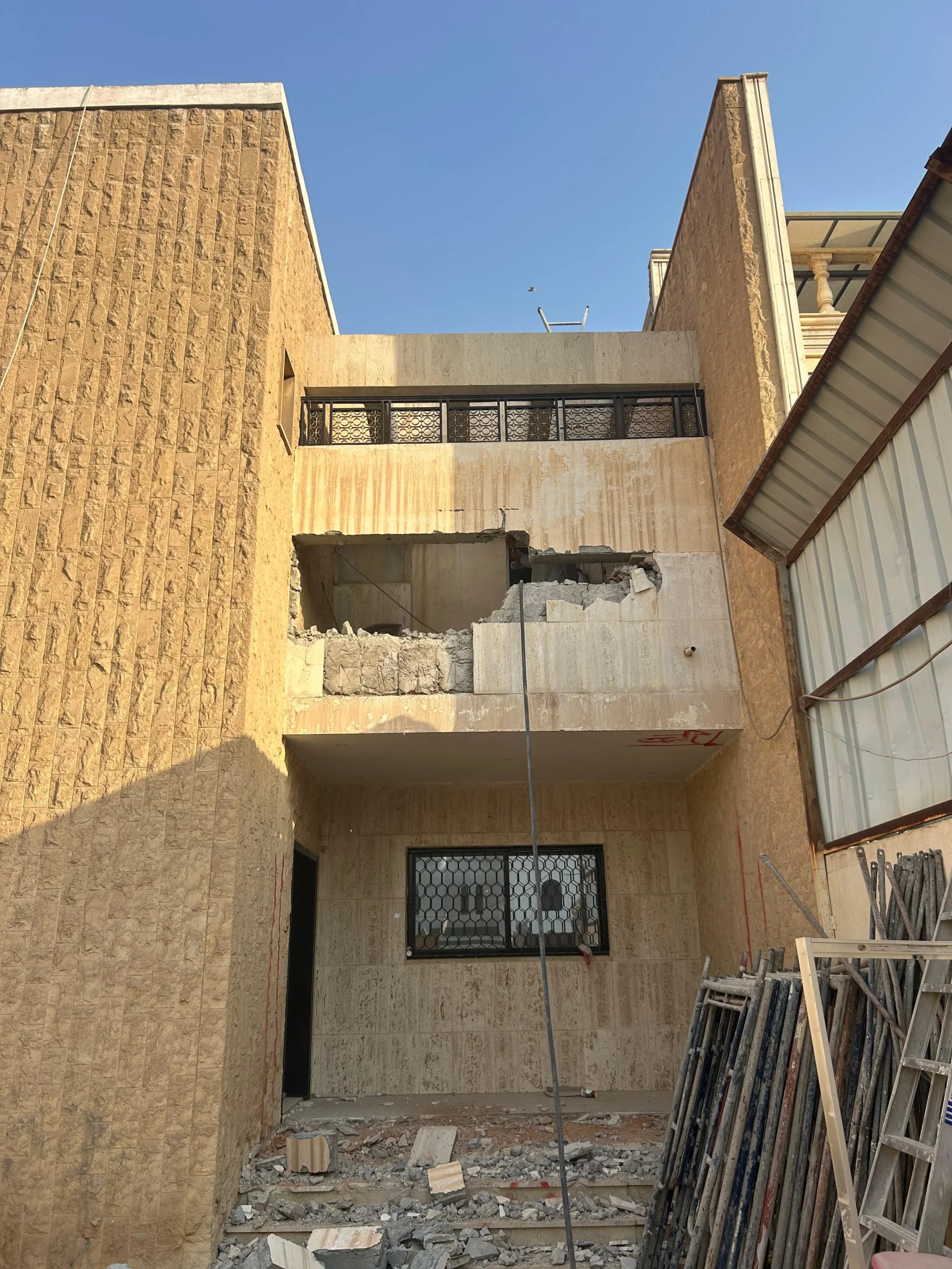- ترميم واجهات المباني والفلل بجميع أنواعها: حجر، بوية، كلادنج، زجاج.